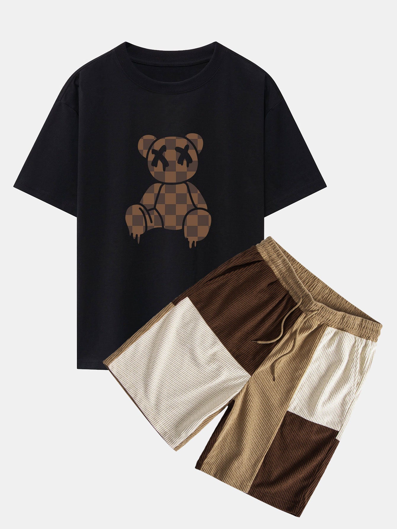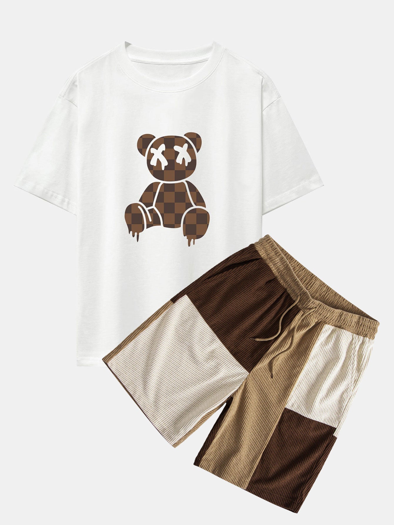 The oversized drop-shoulder tee features a bold dissolving bear graphic with a checkerboard design, blending edgy and playful aesthetics. Paired with colorblock corduroy shorts, this set delivers a unique texture contrast and retro-inspired vibe.